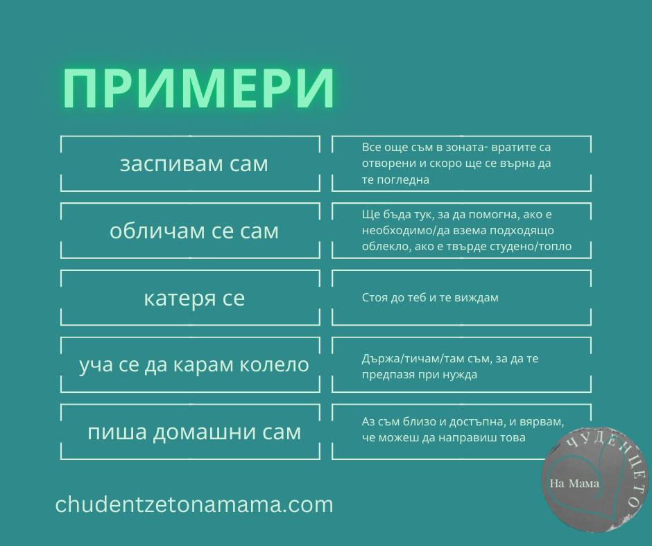 Някои деца заспиват сами без придружител по-рано, други по-късно. Някои се научават да плуват или карат колело по-рано, а на други им трябва повече време. С времето тези неща губят значение – няма значение кога детето е започнало да яде само или да нощува другаде. Важно е усещането на детето, че може да се довери и да потърси помощ, когато има нужда, без да се налага да прави всичко само.